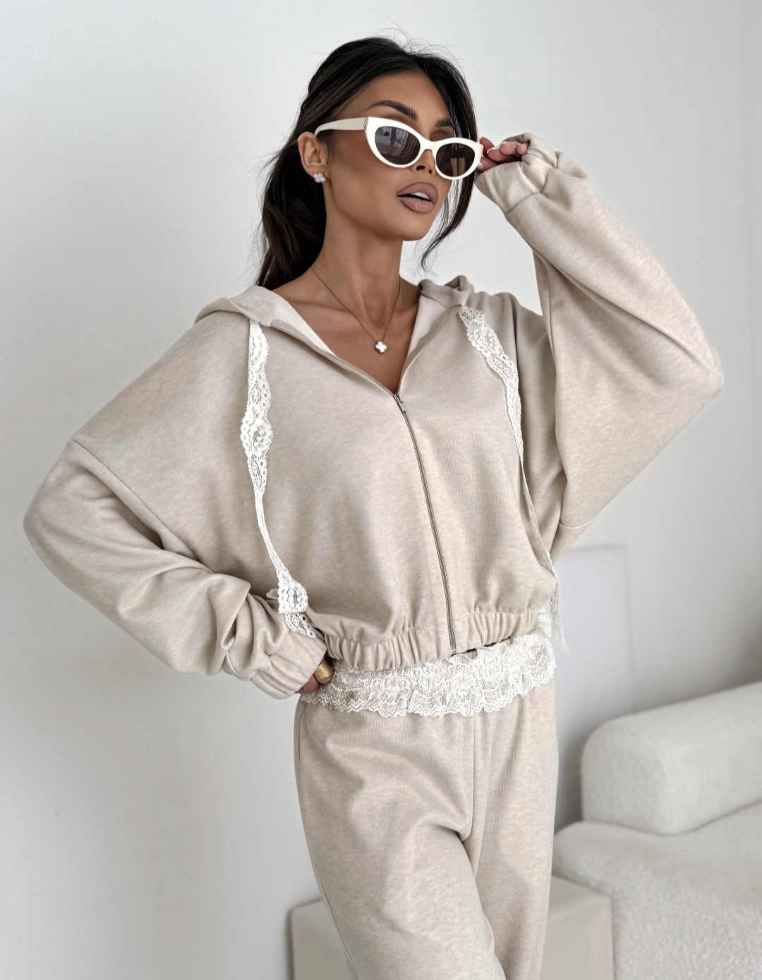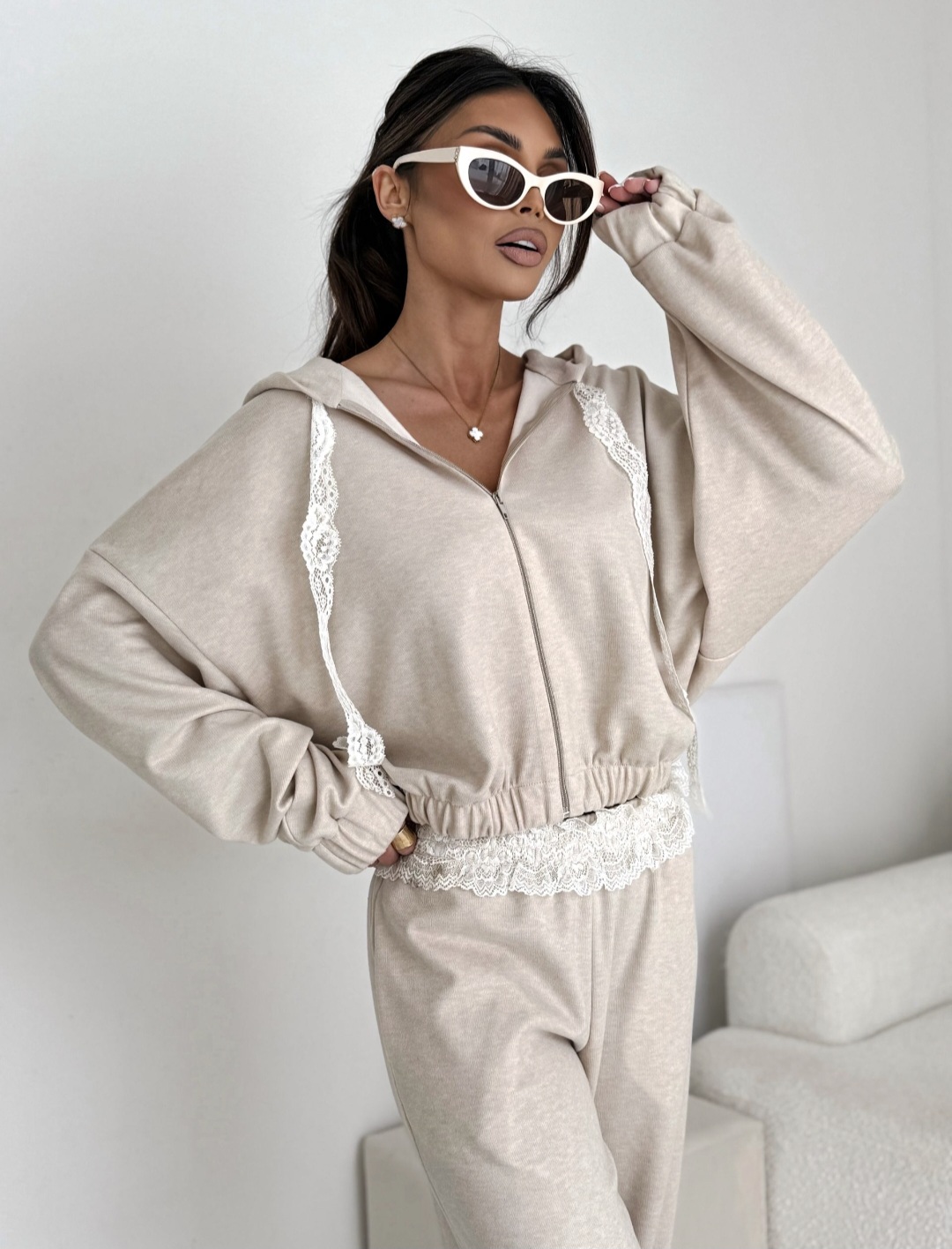 Zestaw rewelacyjnie prezentuje się z białymi sneakersami i okularami przeciwsłonecznymi w stylu retro. Możesz też rozdzielić elementy kompletu – bluzę zestawić z dopasowanymi jeansami, a spodnie z prostym, białym topem.