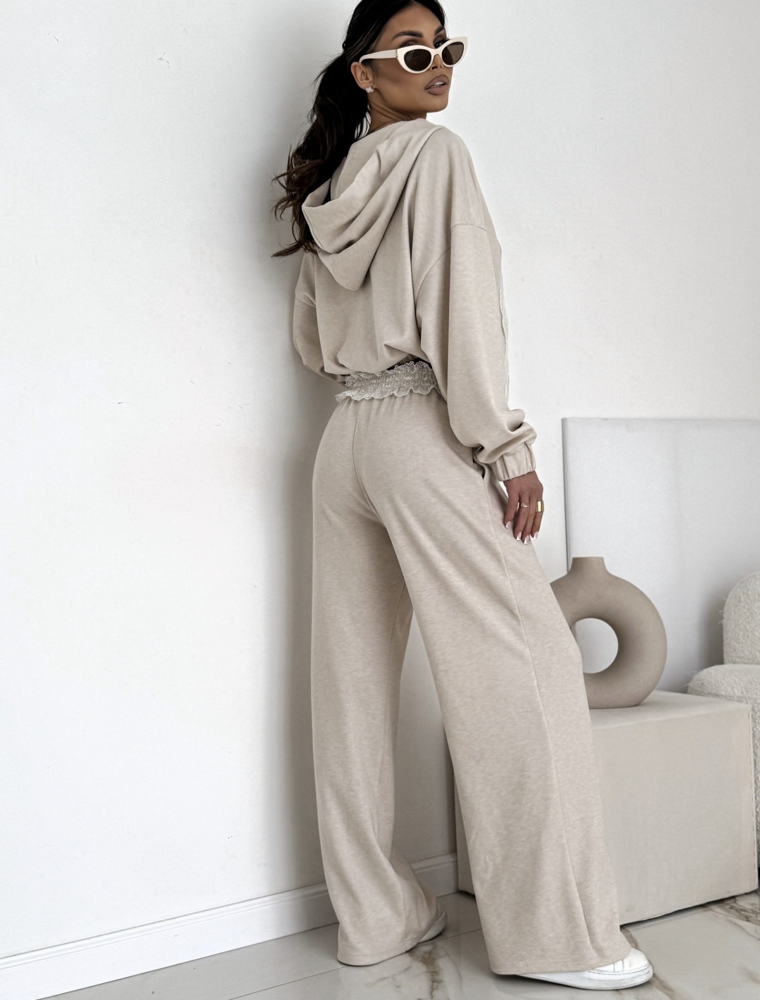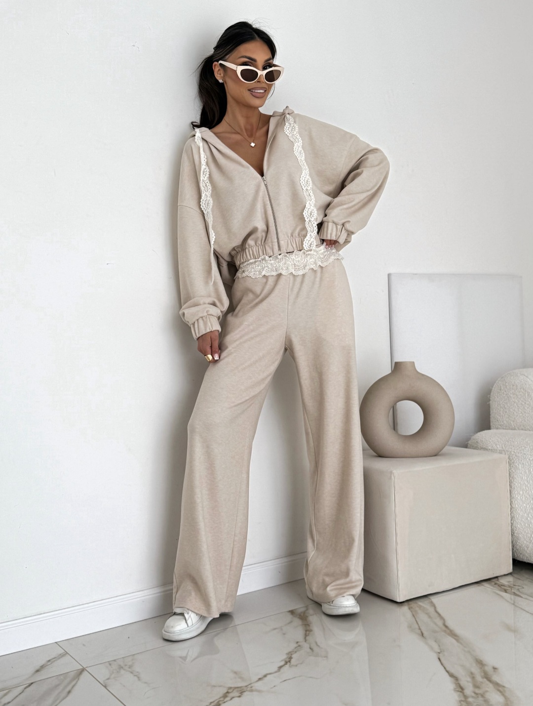 Ten dwuczęściowy komplet to idealne połączenie sportowego luzu i kobiecej delikatności. Wykonany z miękkiej, wysokiej jakości dzianiny w odświeżającym odcieniu beżu, zapewnia komfort na najwyższym poziomie, nie rezygnując przy tym z modnego wyglądu. To zestaw typu effortless chic, w którym poczujesz się stylowo zarówno w domu, jak i podczas wyjścia na miasto.